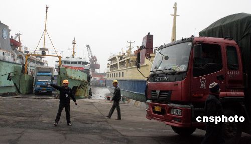 2月4日,?诟鄞a頭,出島和進(jìn)島運(yùn)輸冬季瓜菜在卡車接連不斷。長(zhǎng)江中下游地區(qū)大量大棚蔬菜因雪災(zāi)凍死,位于熱帶的海南島成了名副其實(shí)的“中國(guó)菜籃子”。中國(guó)商務(wù)部、鐵道部、交通部三部委官員目前已聯(lián)合抵瓊,會(huì)商緊急調(diào)運(yùn)海南冬季瓜菜,以保障雪災(zāi)災(zāi)區(qū)人民及港澳地區(qū)的蔬菜供應(yīng)。中新社發(fā) 關(guān)向東 攝