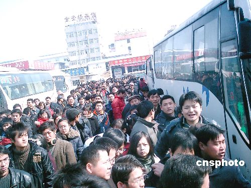 2月4日,安徽省合肥長(zhǎng)途汽車(chē)站迎來(lái)雪后恢復(fù)運(yùn)行的第一個(gè)短途客運(yùn)高峰。由于久雪之后天氣放晴,加上臨近年關(guān),合肥長(zhǎng)途汽車(chē)站內(nèi)旅客激增,當(dāng)日大約有2萬(wàn)多名乘客擁擠在該站車(chē)站內(nèi),排成一條條“長(zhǎng)龍”。中新社發(fā) 張發(fā)平 攝