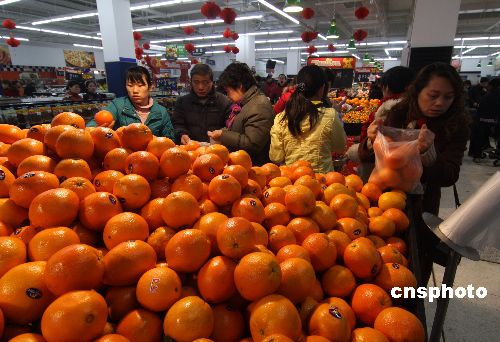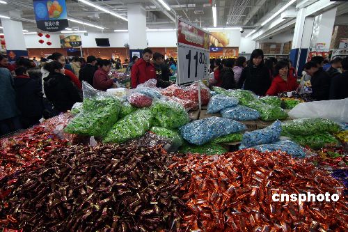 發(fā)表評論 2月4日,婁底市民在超市選購年貨。近日湖南婁底市遭受了50年一遇的冰凍災害,全市95個鄉(xiāng)鎮(zhèn)不同程度受災,倒塌房屋15337間,緊急轉移安置11282人,因災摔死2人,農(nóng)作物受災面積108.71畝,當?shù)馗咚俟贰、省道在冰凍期間不暢通。在抗冰雪凍災中,婁底市迅速采取應對措施,市民及各企業(yè)單位共同參與,將冰凍災害損失降到最低限度。隨著春節(jié)來臨,婁底市節(jié)日市場購銷兩旺、貨足價穩(wěn),市民們紛紛忙于采買年貨。中新社發(fā) 郭國權 攝