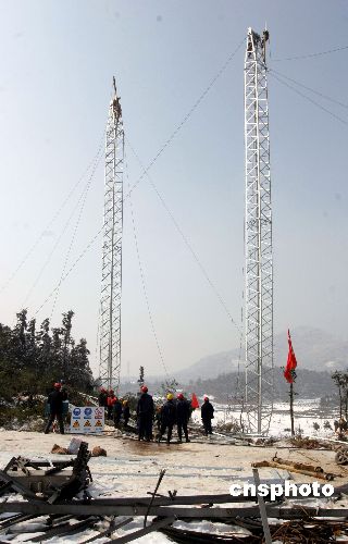 發(fā)表評論 一座塔倒下去,又一座塔立起來,湖南望城縣橋驛鎮(zhèn)月塘村華沙線500千伏塔,電力工人羅海文、羅長明、周景華不幸遇難的送變電倒塌電塔現(xiàn)場,經(jīng)過湖南省送變電建設(shè)有限公司三分公司140多職工和120名武警官兵日夜搶修,2月3日,在原41號鐵塔的廢墟上立起了一座新塔。另外44、43號倒塌的鐵塔也在近日修復(fù)。中新社發(fā) 殷中民 攝