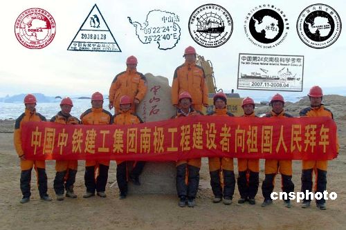 春節(jié)將至,隨中國第24次南極考察計(jì)劃在南極實(shí)施中山站建設(shè)工程的中國中鐵建工集團(tuán)11名職工,在中山站紀(jì)念碑前向祖國人民拜年。南極地理狀況復(fù)雜,基巖硬度高,凍土層深的條件下,每天工作16個(gè)小時(shí)以上,園滿的完成了各工程節(jié)點(diǎn)的任務(wù),被稱為“鐵軍”。中新社發(fā) 同德 攝