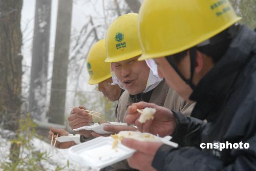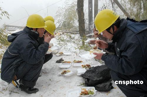 發(fā)表評論 2月6日下午1點,新昌城關(guān)供電營業(yè)所城區(qū)供電服務(wù)班班長梁雍和他的隊員們一起在施工現(xiàn)場吃中飯。當日,浙江新昌縣供電局城關(guān)供電營業(yè)所的員工在該縣城南鄉(xiāng)搶修秦巖177線,目前,新昌有35個行政村因雪災(zāi)尚未通電,561名電力搶修隊員仍奮戰(zhàn)在搶修一線。據(jù)悉,電力工人們?yōu)樵缛胀姡暌癸堃仓荒茉谏缴铣粤。中新社發(fā) 袁云 攝