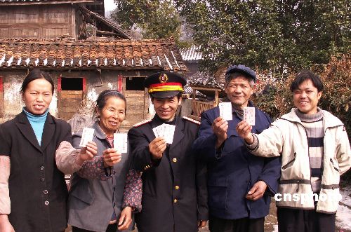 2月8日,凱里車(chē)務(wù)段職工上門(mén)為凱里市紅巖村村民吳章海等送來(lái)預(yù)定返程火車(chē)票。近日,貴州連續(xù)出現(xiàn)了50年罕見(jiàn)的冰凍,為確保農(nóng)民工按時(shí)拿到火車(chē)票,成都鐵路局凱里車(chē)務(wù)段開(kāi)展了多項(xiàng)便民措施,確保返程農(nóng)民工不但走得了而且走得好,真正做到“平安和諧”春運(yùn)。中新社發(fā) 姜澤鵬 攝