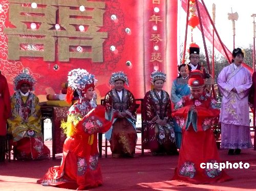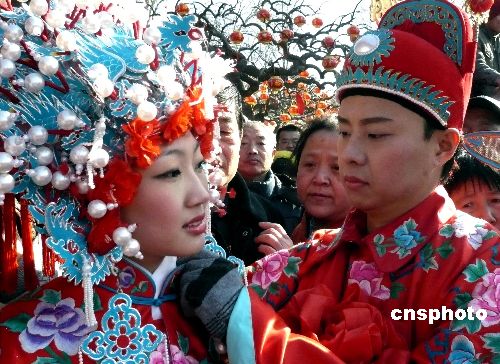 2月8日,由北京大觀園主辦的2008年紅樓廟會(huì)吸引眾多游客,在廟會(huì)傳統(tǒng)的“元妃省親”古裝游行的盛大場(chǎng)景中,大觀園為《紅樓夢(mèng)》一書(shū)中未能成婚的賈寶玉、林黛玉專(zhuān)門(mén)舉行一場(chǎng)別開(kāi)生面的“寶黛成婚”場(chǎng)面,令游客耳目一新。中新社發(fā) 錢(qián)興強(qiáng) 攝