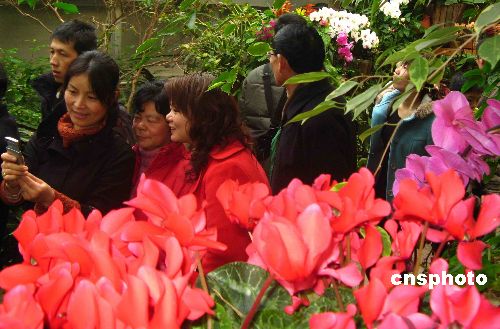 2月8日大年初二,游人在上海植物園“2008迎春花展”上賞花。中新社發(fā) 嚴(yán)大明 攝