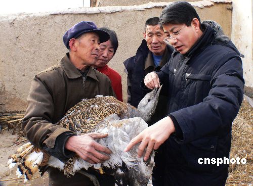 2月9日,一只國(guó)家一級(jí)瀕危保護(hù)鳥(niǎo)類(lèi)在滄州被成功救治。大年初一上墳祭祖的河北黃驊常郭鄉(xiāng)齊趙村的齊延平老人在菜地里發(fā)現(xiàn)了一只受傷的大鳥(niǎo),出于對(duì)保護(hù)鳥(niǎo)類(lèi)的重視齊延平老人將受傷的大鳥(niǎo)抱回了家中,出于好奇前來(lái)觀看的鄉(xiāng)親們中間有人通過(guò)互聯(lián)網(wǎng)得知了這是國(guó)家一級(jí)瀕危保護(hù)鳥(niǎo)類(lèi)大鴇,于是齊延平老人通過(guò)多方打聽(tīng)終于在大年初三這天聯(lián)系到了滄州師專生物系教授、滄州野生動(dòng)物救護(hù)中心負(fù)責(zé)人孟德榮,孟教授當(dāng)即從滄州乘出租車(chē)趕到100公里外齊延平老人家前來(lái)接治受傷大鴇。據(jù)孟教授介紹,這只大鴇翅膀出現(xiàn)了不同程度的撕裂傷,其受傷主要原因是因?yàn)檎`食了有毒食物所致,目前受傷大鴇以被接回滄州野生動(dòng)物救護(hù)中心進(jìn)行進(jìn)一步的救治。中新社發(fā) 楊志濤 攝