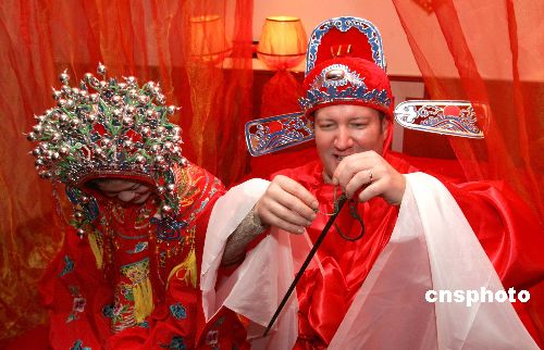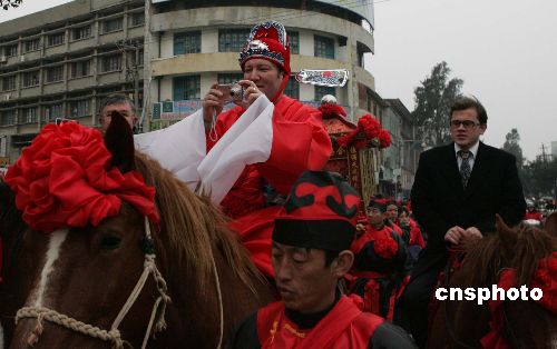 春節(jié)期間,福建省平潭縣城的一支老外娶親隊讓大街小巷沸騰了起來,娶親的法國人史蒂文按正宗的中國傳統(tǒng)婚俗迎娶平潭新娘。這對新人是一九九九年在廣州廣交會上認識,經(jīng)歷了近十年愛情長跑才走到了這一天。中新社發(fā) 小小 攝