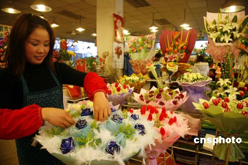 2月11日,上海各路花商紛紛展開“情人節(jié)鮮花”市場的布局,圖為花商為最暢銷的進(jìn)口“藍(lán)色妖姬”包裝。據(jù)了解,“藍(lán)色妖姬”近年來一直受上海人寵愛,由十一支進(jìn)口“藍(lán)色妖姬”組成的花束,代表著“一心一意”口彩,是“情人節(jié)”中花中新貴,通常價格在千元以上。中新社發(fā) 潘索菲 攝