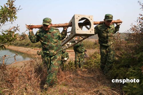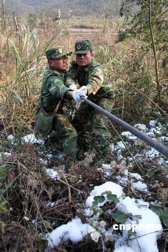 2月13日,南京軍區(qū)入贛指戰(zhàn)員在江西東鄉(xiāng)溫松線電力搶修現(xiàn)場進(jìn)行清障。江西7個設(shè)區(qū)市用電告急,恢復(fù)供電迫在眉睫。2月12日起,南京軍區(qū)派出1.2萬名官兵奔赴江西7個設(shè)區(qū)市電力搶修現(xiàn)場,同江西省軍區(qū)1.3萬余名官兵、民兵預(yù)備役人員一道,參加抗災(zāi)救災(zāi)活動。中新社發(fā) 何江華 攝