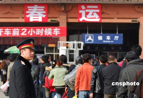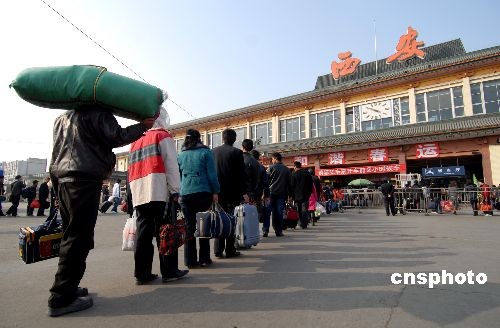 2月19日,旅客在西安火車站排隊(duì)有序進(jìn)站乘車。元宵節(jié)將至,外出民工與返校學(xué)生流、探親流等客流全面啟動(dòng),西安火車站客流持續(xù)攀升。鐵路部門(mén)采取提前二小時(shí)進(jìn)站、在廣場(chǎng)設(shè)立臨時(shí)候車區(qū)等措施,做好旅客乘車組織及服務(wù)工作,確?土鞲叻灏踩⑵椒(wěn)、有序。中新社發(fā) 唐振江 攝