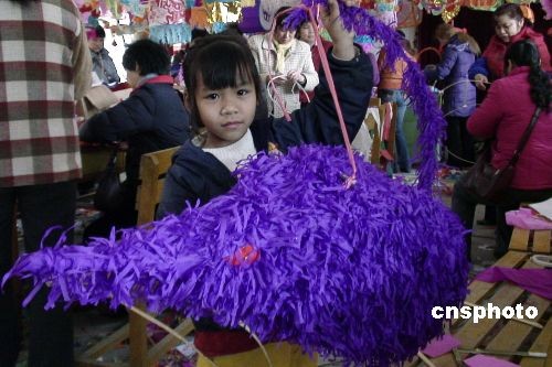 二月二十日,廣西南寧市菠蘿嶺社區(qū)居民忙著扎制花燈,一女孩展示扎制好的鼠形花燈。過(guò)元宵賞花燈是當(dāng)?shù)亓?xí)俗。中新社發(fā) 王剛 攝