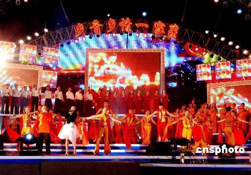 2月20日正月十四晚,前來參加“鄉(xiāng)音鄉(xiāng)情一家親”2008“兩馬同春鬧元宵”大型焰火文藝晚會演出的馬尾合唱團、馬尾大頭娃娃表演隊與馬祖合唱團、馬祖電音孩仔演出隊的成員共同上演開場歌舞《今宵多美好》。“兩馬同春鬧元宵”活動已經(jīng)成功舉辦五屆。中新社發(fā) 劉可耕 攝