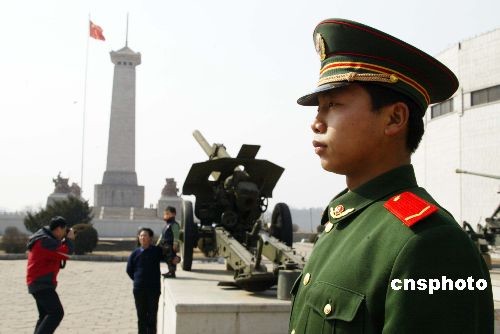 3月1日,丹東邊防檢查站的值勤戰(zhàn)士正在丹東抗美援朝紀(jì)念館執(zhí)行警衛(wèi)任務(wù)。作為遼寧省五家大型博物紀(jì)念館之一的抗美援朝紀(jì)念館當(dāng)天正式向公眾永久免費(fèi)開放,有1000多名國內(nèi)外游客和市民進(jìn)入紀(jì)念館參觀。為紀(jì)念抗美援朝戰(zhàn)爭勝利55周年,紀(jì)念館建館50周年,展館新增設(shè)的專題展覽成為當(dāng)天開放接待參觀的亮點(diǎn)。中新社發(fā) 陳浩浩 攝