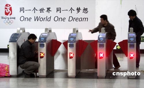 3月3日,工作人員在調(diào)試北京地鐵1號線天安門東站的自動檢售票系統(tǒng)。隨著奧運會臨近,北京地鐵1、2號線的新設(shè)備配套系統(tǒng)正在加緊調(diào)試,以便服務(wù)奧運會的正常使用。據(jù)工作人員介紹,地鐵車站安裝的新設(shè)備是自動檢售票系統(tǒng),出入口處的是閘機,其相應(yīng)的配套設(shè)備還有自動售票和充值機。目前5號線已全線調(diào)試完畢,但還需時間對地鐵1、2、13號線進行調(diào)試,預(yù)計6月后,北京地鐵線路都要開通和使用自動檢售票系統(tǒng)。中新社發(fā) 吳芒子 攝