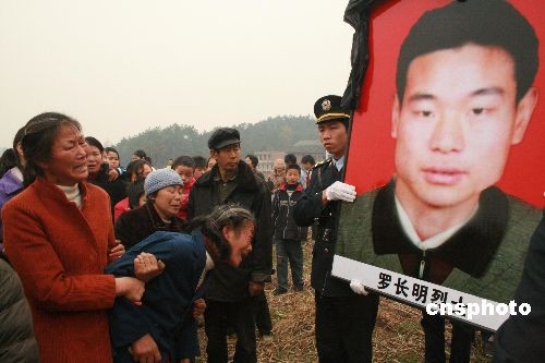 3月4日,羅海文、羅長(zhǎng)明、周景華三位抗冰搶險(xiǎn)烈士骨灰送行儀式在長(zhǎng)沙市明陽(yáng)山殯儀館舉行。當(dāng)日上午,湖南省漣源市白馬鎮(zhèn)楊世村的父老鄉(xiāng)親早早在村口等待,當(dāng)載著羅海文、羅長(zhǎng)明兩英烈骨灰盒的靈車一出現(xiàn),鄉(xiāng)親們用震天的鑼鼓和齊鳴的鞭炮迎接英雄魂歸故里。