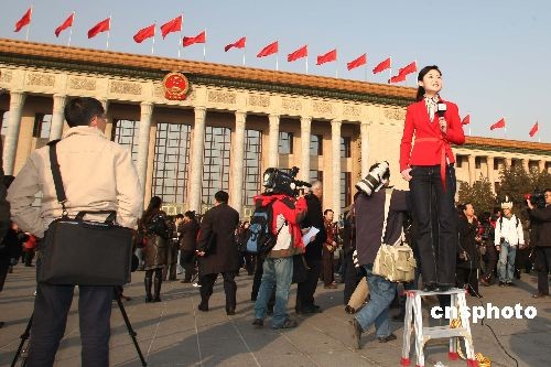 發(fā)表評論 三月五日上午九時,十一屆全國人大一次會議在北京人民大會堂隆重開幕,一名女記者在大會堂前登梯進行新聞報道。中新社發(fā) 盛佳鵬 攝