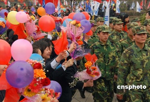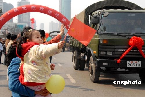 發(fā)表評論 2008年3月5日,貴陽市人民廣場,援黔抗凝凍部隊返程受到社會各界人民群眾夾道歡送。據(jù)悉,貴州省在受凝凍災(zāi)害期間,得到中國人民解放軍及社會各界的援助,電力搶修按預(yù)期提前190余天完成,目前貴州送往省外的電路全部投入送電。中新社發(fā) 張?zhí)炝?攝