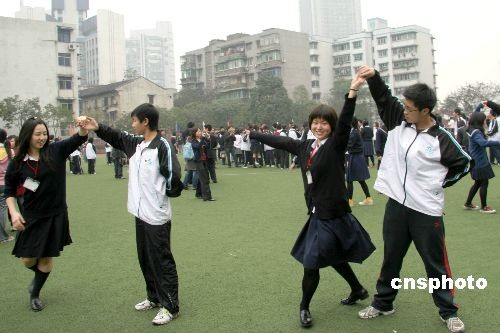 三月十一日,來(lái)自日本石川縣、滋賀縣、愛知縣的高中生訪華代表團(tuán)來(lái)到重慶外國(guó)語(yǔ)學(xué)校,與中國(guó)的高中生開展聯(lián)誼交流活動(dòng),圖為中日兩國(guó)高中生在校園里翩翩起舞。今年是中日兩國(guó)領(lǐng)導(dǎo)人共同確定的“中日青少年友好交流年”,日本此次訪華的青少年友好使者代表團(tuán)一行共一千人,分赴上海、重慶、廣州、成都、杭州、大連等地訪問(wèn)交流。中新社發(fā) 孫自法 攝