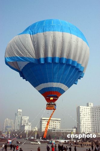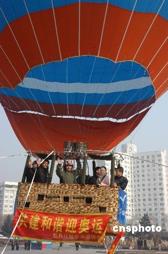 3月12日,黑龍江省牡丹江市航空協(xié)會舉辦的迎奧運(yùn)熱氣球升空活動在江濱廣場舉行。一只體積達(dá)8000立方米、載荷2.2噸、亞洲最大的熱氣球在廣場升起,“共建和諧奧運(yùn)”的條幅代表了航空愛好者的心聲。此次活動吸引了許多市民前來觀看。中新社發(fā) 張克非 攝