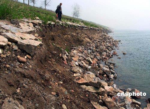2008年3月18日,枝江市白洋鎮(zhèn)向家壩沙灣堤外垸,崩塌的長(zhǎng)江堤防。據(jù)悉,自3月10日以來(lái),湖北枝江市白洋鎮(zhèn)向家壩沙灣堤外垸長(zhǎng)江堤防連續(xù)發(fā)生崩塌。該處垸堤長(zhǎng)1750米,崩長(zhǎng)360米,崩坎平均高1.5米至3.5米,最高處達(dá)5米;垸內(nèi)有14戶(hù)人家,耕地183畝。據(jù)專(zhuān)家分析,該堤段崩岸主要原因是:一、清水下泄,崩岸處正處清江河口對(duì)岸,迎流頂沖,護(hù)坡腳槽形成吊坎后崩垮;二、長(zhǎng)江近年處在中低水位運(yùn)行,護(hù)坡處淤沙沖失后未及時(shí)維護(hù)。目前,枝江正在組織勞力、機(jī)械、石源對(duì)該段進(jìn)行突擊整治,力爭(zhēng)汛前全面脫險(xiǎn)。中新社發(fā) 劉君鳳 攝