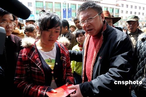 3月22日,拉薩一服裝店門前,中國(guó)新聞社西藏分社社長(zhǎng)柳俊武向受害者卓嘎捐助善款。在拉薩3月14日發(fā)生的打砸搶燒破壞活動(dòng)中,該服裝店的五名女員工被活活燒死在店中,卓嘎是當(dāng)時(shí)的幸存者。中新社發(fā) 廖攀 攝