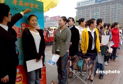 3月29日,中國(guó)新空姐招募大匯濟(jì)南選區(qū)在山東濟(jì)南開鑼。主辦方將目測(cè)海選賽場(chǎng)設(shè)立在廣場(chǎng)上,讓追逐藍(lán)天夢(mèng)的女孩子接受市民評(píng)判。僅當(dāng)日上午就有1000多名亮麗女孩前來應(yīng)征。2008中國(guó)新空姐招募大匯由中國(guó)南方航空公司、中華全國(guó)青年聯(lián)合會(huì)、江蘇衛(wèi)視聯(lián)合主辦。依托民航空乘人員專業(yè)考核標(biāo)準(zhǔn),創(chuàng)新引入“民航旅客評(píng)選”制度,旨在打造國(guó)內(nèi)最專業(yè)和最具影響力的空姐招聘平臺(tái)。中新社發(fā) 張侃 攝