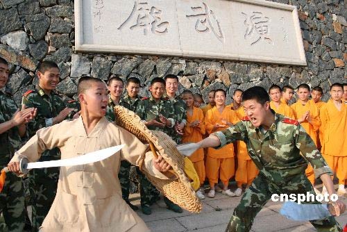 4月6日,武警福建泉州支隊四中隊官兵們與駐地南少林武僧進(jìn)行了一場“武林爭霸”賽活動。通過活動,官兵們既增加了對中國傳統(tǒng)少林文化的認(rèn)識了解,也激發(fā)了愛警習(xí)武、苦練軍事技能本領(lǐng)的決心。圖為武警戰(zhàn)士與少林武僧“切磋”功夫的情景。中新社發(fā) 張九強(qiáng) 攝