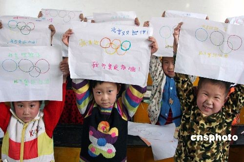 4月7日,邢臺博文幼兒園的小朋友展示自己畫的奧運(yùn)標(biāo)志。今年以來,該園讓孩子們學(xué)習(xí)奧運(yùn)、社會和家庭禮儀,訓(xùn)練他們在日常生活中的文明問候、待客等良好習(xí)慣,教育孩子們爭做禮儀小使者,文明奧運(yùn)宣傳員。 陳雷 攝