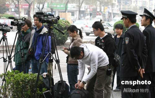 4月11日,天津市第二中級人民法院開庭對原中共上海市委書記陳良宇做一審判決。清晨開始,就有包括香港媒體在內(nèi)的多家媒體記者聚集在天津二中院附近進(jìn)行跟蹤報道。中新社發(fā) 齊天 攝