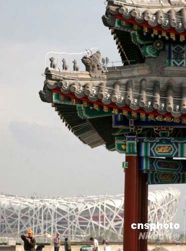 4月21日,北京奧林匹克中心區(qū)經(jīng)過一夜春雨的洗禮顯得清新而壯美。剛建好的雕梁畫棟的“九牌樓”、亭臺(tái)與國家體育場“鳥巢”遙相互應(yīng),現(xiàn)代與古典完美結(jié)合。作者: 吳芒子