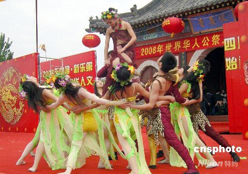 22日,第四屆伏羲文化旅游節(jié)在“羲皇圣里”河北省新樂(lè)市開(kāi)幕。來(lái)自美國(guó)、加拿大、臺(tái)灣、香港等國(guó)家和地區(qū)的萬(wàn)余名華人代表、學(xué)術(shù)社團(tuán)代表、伏羲文化專(zhuān)家、易學(xué)專(zhuān)家、各地客商及當(dāng)?shù)孛癖婟R聚“伏羲臺(tái)”,舉行2008年世界華人公祭人文始祖伏羲大典。新樂(lè)自古有“羲皇圣里”之稱,商周以來(lái),這里就是世界華裔同胞尋根祭祖的圣地,每年陰歷三月十八的伏羲廟會(huì),香火鼎盛,連綿不絕,延續(xù)至今。圖為祭祀大典當(dāng)中的樂(lè)舞告祭。中新社發(fā) 牛琳 攝