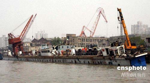 4月29日早上,上海黃浦江一個大型船塢傾斜下沉,17人獲救,2人失蹤。發(fā)生事故的是長158、寬34米的“廬山塢”大型船塢,側(cè)翻的船塢呈現(xiàn)30度的傾斜,船塢上的一些附屬設(shè)施淹沒到水面以下。目前,失蹤人員依然杳無音訊,搜救打撈工作仍在進(jìn)行,事故確切原因仍在調(diào)查中。中新社發(fā) 宣克炅 攝