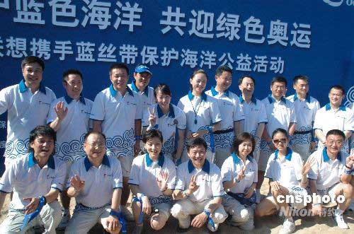 北京奧運會火炬接力海南省傳遞五月四日傳遞在三亞首發(fā)。三日聯(lián)想和"藍絲帶"在三亞組織保護海洋活動,倡導(dǎo)綠色奧運。圖為聯(lián)想奧運火炬手在三亞灣邊參與公益活動。中新社發(fā) 王辛莉 攝