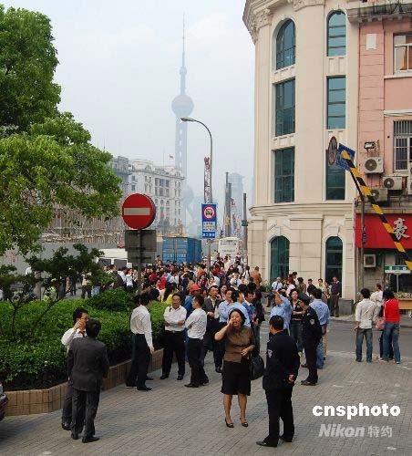 據(jù)上海市地震局剛剛提供的消息,中國地震臺測定,5月12日14時28分在四川汶川縣發(fā)生7.8級地震,上海高層建筑普遍有感,但不會對上海造成危害。圖為位于市中心35層的上海工商聯(lián)大廈樓前聚集的慌忙跑出的人群。中新社發(fā) 段更強(qiáng) 攝