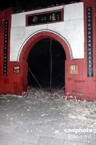 5月12日14時(shí)28分,在四川汶川縣(北緯31度,東經(jīng)103.4度)發(fā)生7.8級(jí)地震。都江堰市區(qū)受地震災(zāi)害影響嚴(yán)重,多處房屋倒塌。圖為都江堰景區(qū)受損的大門(mén)。 中新社發(fā) 黃榮 攝