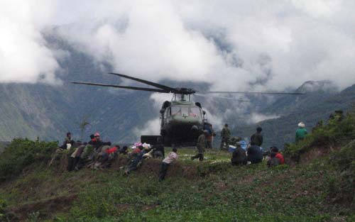 首批救援直升機(jī)14日上午成功降落此次地震震中汶川縣城,新華社記者 徐壯志 攝。
