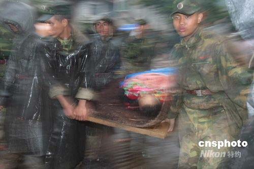 5月13日,中國空降兵6500多名官兵分別乘坐空軍遠輸機奔赴四川重災區(qū),分五路兵力,分別在什邡、德陽、茂縣、等重災區(qū)展開救援。圖為解放軍士兵成功救出一名傷者。中新社發(fā) 譚超 攝