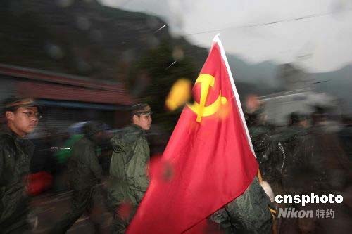 5月13日,中國空降兵6500多名官兵分別乘坐空軍遠(yuǎn)輸機(jī)奔赴四川重災(zāi)區(qū),分五路兵力,分別在什邡、德陽、茂縣、等重災(zāi)區(qū)展開救援。圖為共產(chǎn)黨員沖在搶險(xiǎn)救災(zāi)第一線。中新社發(fā) 譚超 攝