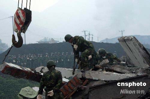 5月14日,中國空降兵某部已出動(dòng)6500人在四川什邡縣境內(nèi)災(zāi)情最嚴(yán)重的洛水、紅白等地緊急搶救被困群眾。圖為空降兵戰(zhàn)士用鐵鉗剪斷鋼筋清混凝土救人。中新社發(fā) 譚超 攝