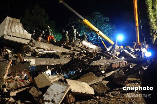 四川汶川縣5月12日發(fā)生7.8級(jí)地震后,北川縣北川中學(xué)受到極大的迫害,將近三千名的學(xué)生中僅有一半學(xué)生生存,另一部分學(xué)生因樓房倒塌而遇難或受傷?拐鹣狸(duì)員不顧艱險(xiǎn)連續(xù)工作,利用不同工具挖掘被壓人員,并及時(shí)成功搶救出一批學(xué)員。中新社發(fā) 鄒憲 攝