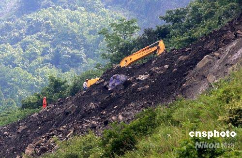5月14日,四川都江堰紫平鋪水庫附近213國道,搶險(xiǎn)隊(duì)伍用機(jī)器清除塌方山石。由于213國道數(shù)十處嚴(yán)重塌方,從都江堰到映秀、汶川的唯一道路被堵塞難以疏通,對災(zāi)區(qū)的物資救援較為艱難。中新社發(fā) 周青先 攝