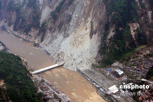 5月15日,在地震中中斷的汶川縣公路仍未完全修復(fù),這是當(dāng)日航拍的垮塌公路橋梁。此次大地震中,位于震中的汶川縣附近道路受到嚴(yán)重破壞,救災(zāi)部隊(duì)、人員和醫(yī)療、生活物資遲遲不能從陸路進(jìn)入。中新社發(fā) 張雷 攝