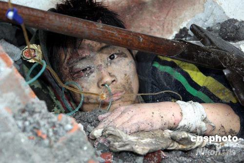 受災(zāi)嚴重的四川省北川縣北川中學(xué)校舍全部倒塌,圖為5月13日拍攝的廢墟中的幸存學(xué)生。中新社發(fā) 張雷 攝