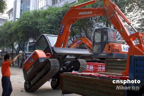2008年5月15日,地震災(zāi)區(qū)都江堰市危樓排險工作正在進(jìn)行中。目前來自成都市企業(yè)的志愿抗震救災(zāi)隊伍攜帶大型機械車輛開進(jìn)都江堰市區(qū),與解放軍部隊一起展開危樓居民區(qū)的排險、救災(zāi)、防疫工作。圖為成都市一企業(yè),派數(shù)量可觀的大小挖掘機和破損機進(jìn)入江堰市危樓疏散區(qū)。汶川7.8級地震,給都江堰市帶來巨大破壞。目前危樓居民區(qū)疏散、安置工作已展開,取得一定成果。中新社發(fā) 鄒憲 攝
