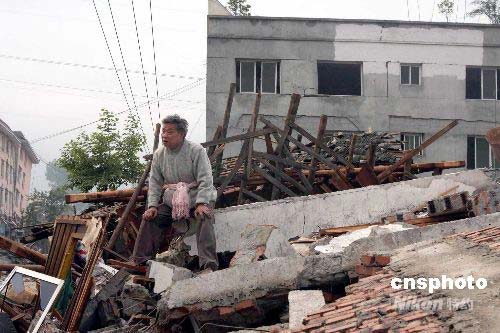 四川大地震,從都江堰到汶川縣映秀鎮(zhèn)沿線民房和交通受損嚴(yán)重,許多受困的居民紛紛離家趕往安全地點,也有許多居民想回家看往地震區(qū)的親人。圖為14日 ,一直堅信老伴還活著的居民在自家的廢墟前等待救援。中新社發(fā) 黃榮 攝