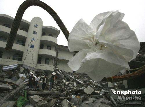 圖:聚源中學(xué)廢墟上系白花悼念遇難師生