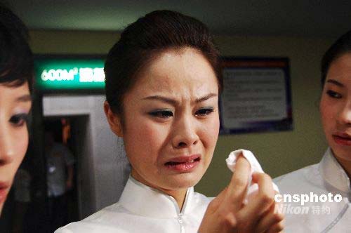 十七日下午,二00八中國新空姐招募大匯廣州賽區(qū)舉行晉級賽,一位來自四川災(zāi)區(qū)的選手說起家鄉(xiāng)的災(zāi)情不禁淚流滿面。中新社發(fā) 柯小軍 攝