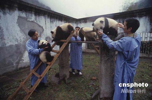 四川省汶川縣發(fā)生里氏7.8級(jí)強(qiáng)烈地震后,位于震中的臥龍大熊貓保護(hù)區(qū)通訊和交通全部中斷,與外界失去聯(lián)系。16日,兩名保護(hù)區(qū)工作人員攜帶衛(wèi)星電話坐直升飛機(jī)降落到臥龍以后,得到最新消息:繁育基地的大熊貓圈舍損毀嚴(yán)重,14座完全損毀,18座嚴(yán)重?fù)p毀,但因?yàn)橛袊鷫,絕大部分大熊貓目前安全。幼仔已被轉(zhuǎn)移到平緩的安全地帶,但暫住條件相對(duì)擁擠。圖為地震之前,臥龍研究人員在精心照顧大熊貓幼仔。中新社發(fā) 羅小韻 攝