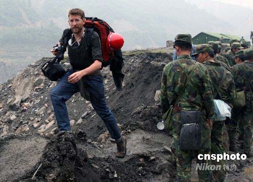 一名美國《紐約時報》的攝影記者,5月17日晚通過解放軍工兵部隊剛剛打通的由都江堰至四川省汶川大地震核心重災區(qū)映秀鎮(zhèn)的簡易公路進入映秀鎮(zhèn)采訪。四川省汶川地區(qū)發(fā)生大地震,引起國際媒體的高度關注,災區(qū)內經?梢钥吹酵鈬浾叩纳碛。中新社發(fā) 任晨鳴 攝