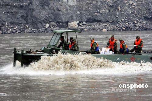 圖:成都軍區(qū)官兵出動軍用船運送災(zāi)民